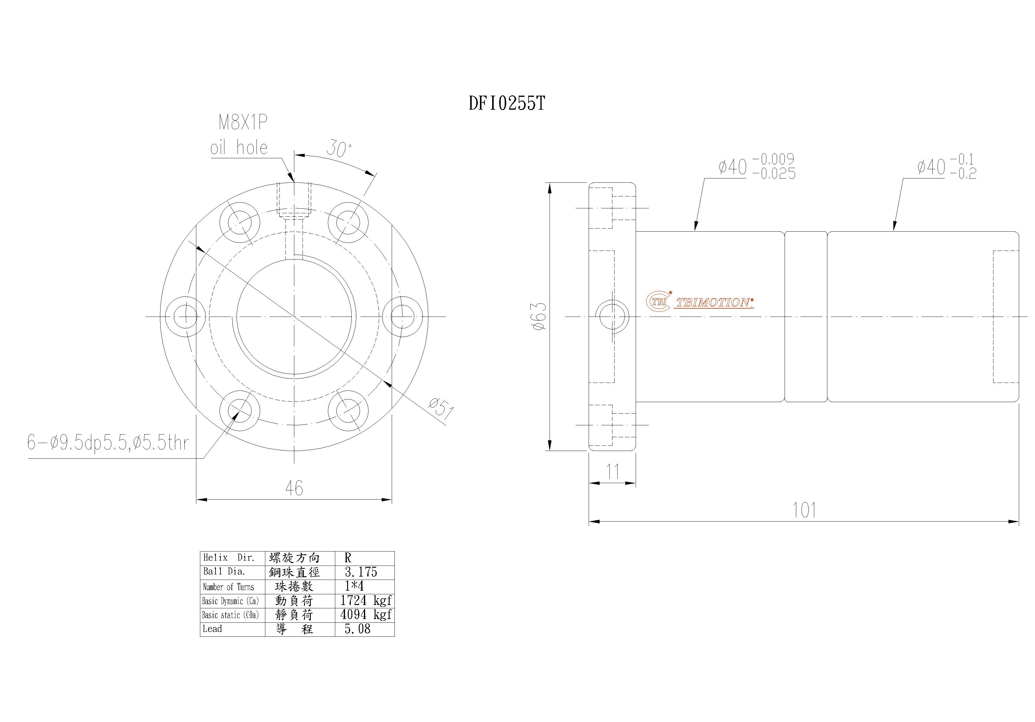 tbi滾珠絲桿DFI2504、DFI255T螺母尺寸圖示: