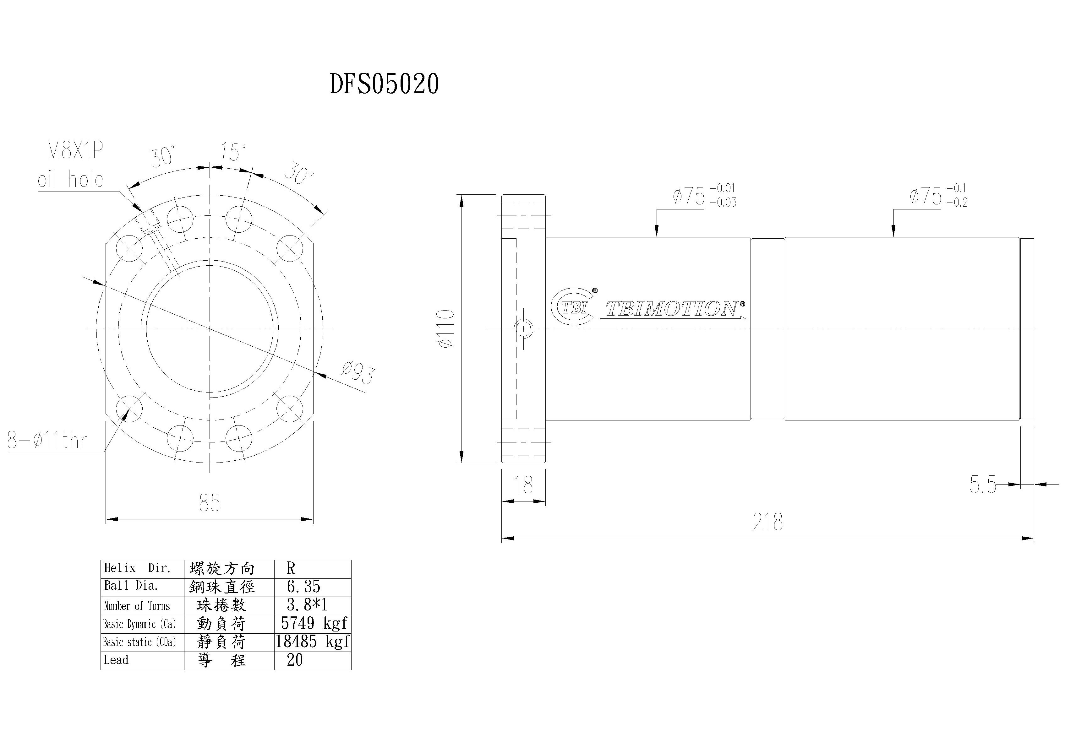 tbi滾珠絲桿螺母DFSR05020T1D,絲桿直徑50,導(dǎo)程20,珠圈數(shù)3.8*1,珠直徑6.35,雙切邊雙螺母,動額定負荷5749,靜額定負荷18485,剛性116.