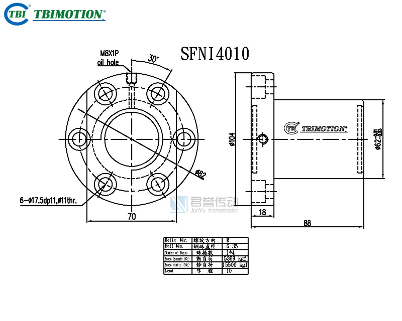 tbi滾珠絲桿螺母SFNIR04010T4D,SFNIR04010T4N,法蘭雙切邊或者全圓,絲桿直徑40,導(dǎo)程10,珠圈數(shù)1*4,珠直徑6.35,動(dòng)額定負(fù)荷5399,靜額定負(fù)荷15500,剛性72。