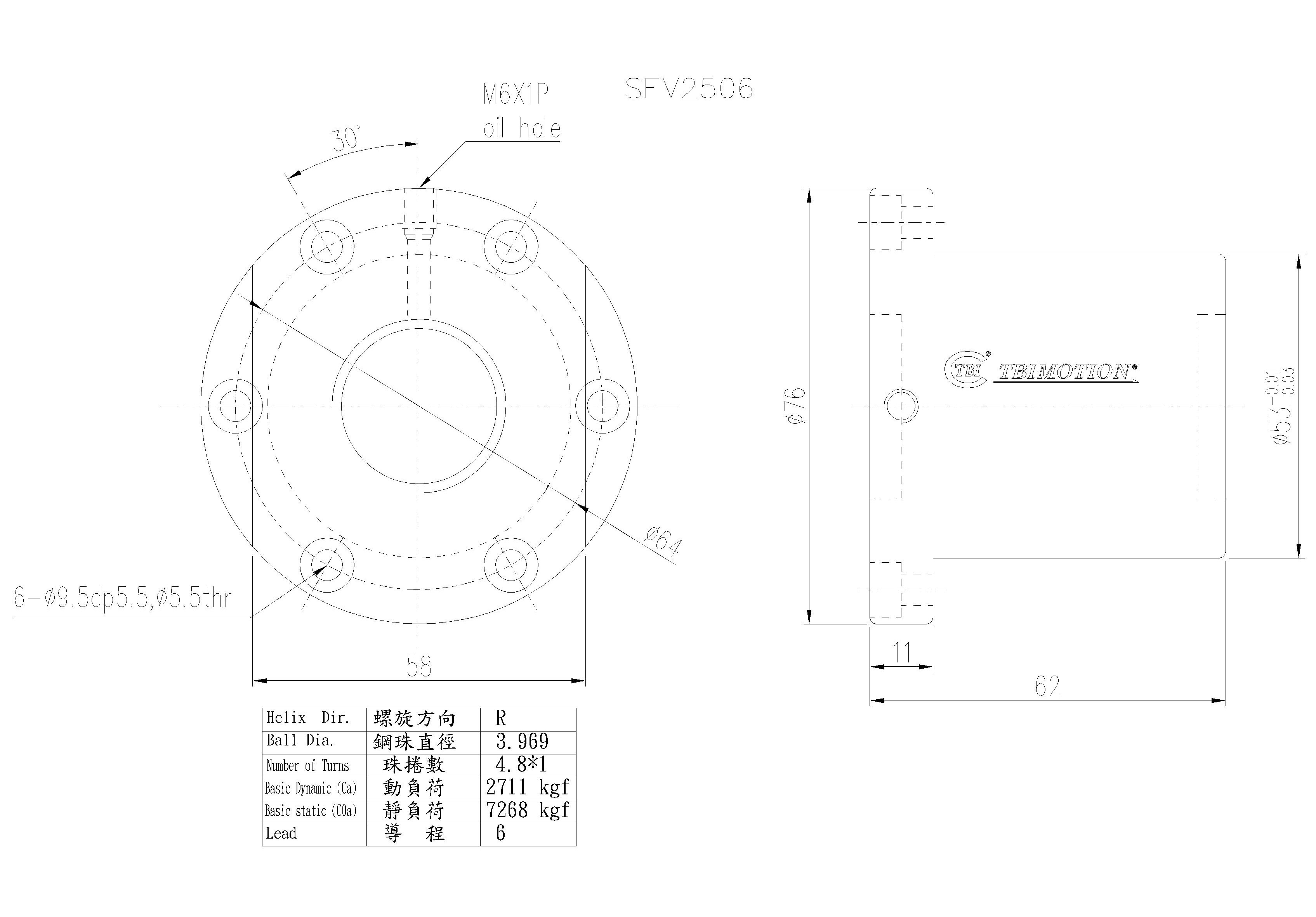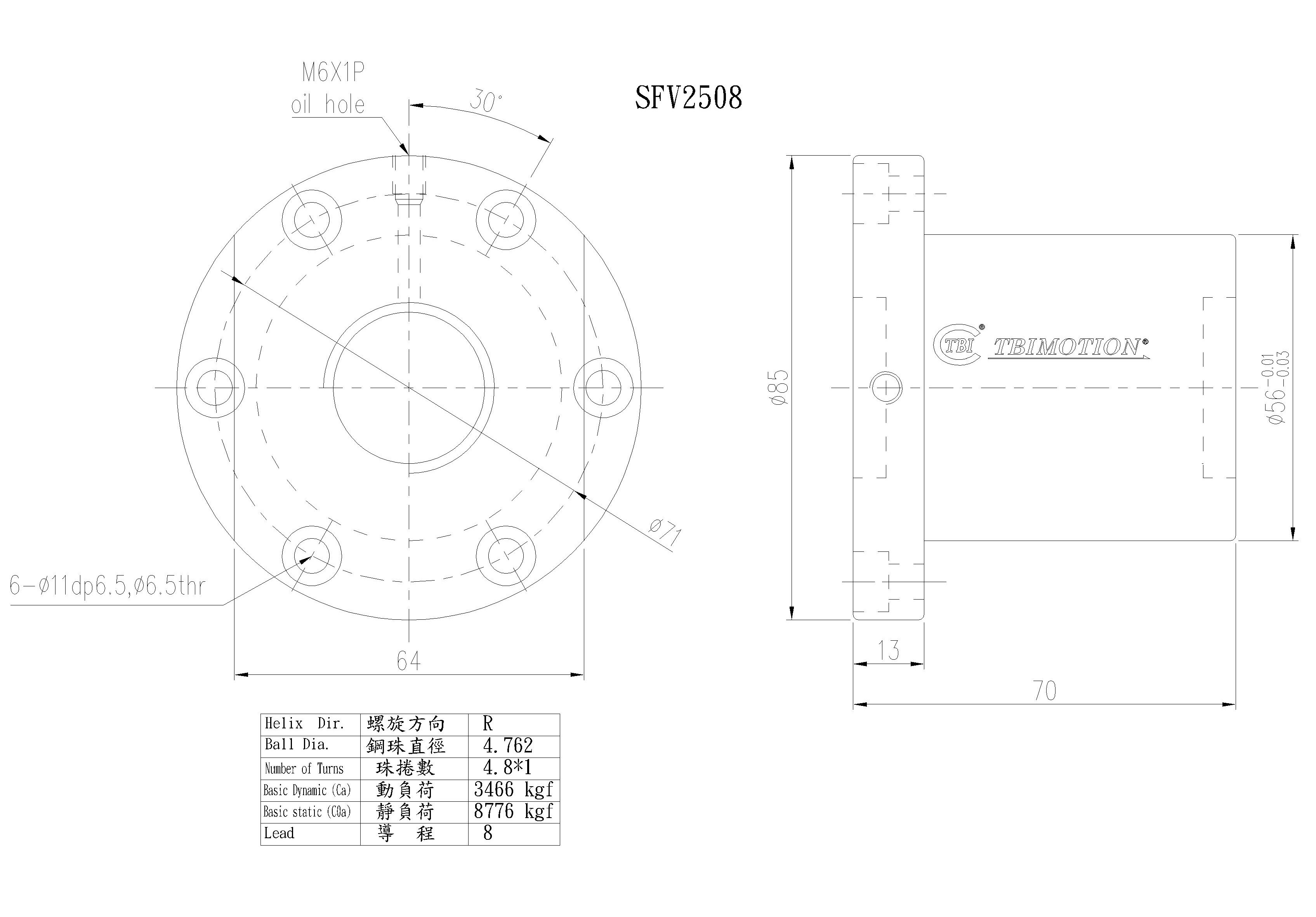 tbi滾珠絲桿SFV2505、SFV2506、SFV2508、SFV2510、SFV2525螺母尺寸圖示: