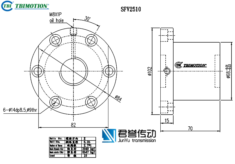 tbi滾珠絲桿螺母SFVR02510B1D,SFNIR02510B1N,法蘭雙切邊或者全圓,絲桿直徑25,導程10,珠圈數(shù)2.7*1,珠直徑6.35,動額定負荷3040,靜額定負荷6547,剛性37。