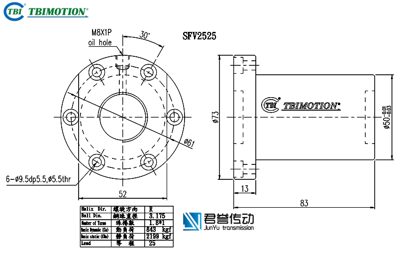 tbi滾珠絲桿螺母SFVR02525A1D,SFNIR02525A1N,法蘭雙切邊或者全圓,絲桿直徑25,導程25,珠圈數(shù)1.8*1,珠直徑3.175,動額定負荷843,靜額定負荷2199,剛性22。