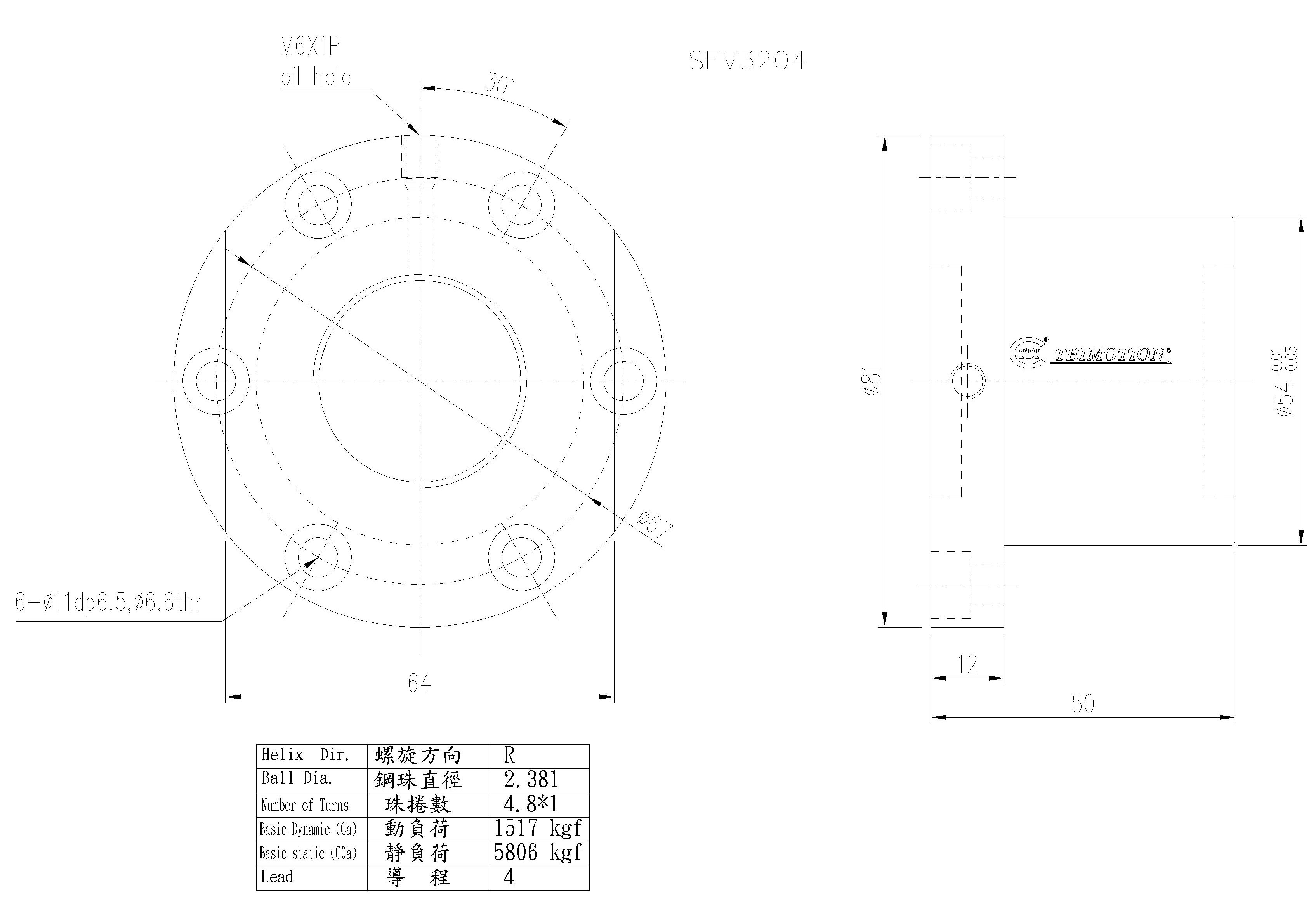 tbi滾珠絲桿SFV3204、SFV3205、SFV3206、SFV3208、SFV3210、SFV3220螺母尺寸圖示:
