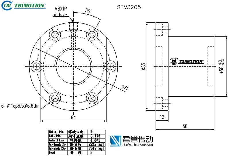 tbi滾珠絲桿螺母SFVR03210D1D,SFNIR03210D1N,法蘭雙切邊或者全圓,絲桿直徑32,導(dǎo)程10,珠圈數(shù)4.8*1,珠直徑6.35,動額定負(fù)荷5620,靜額定負(fù)荷14649,剛性76。