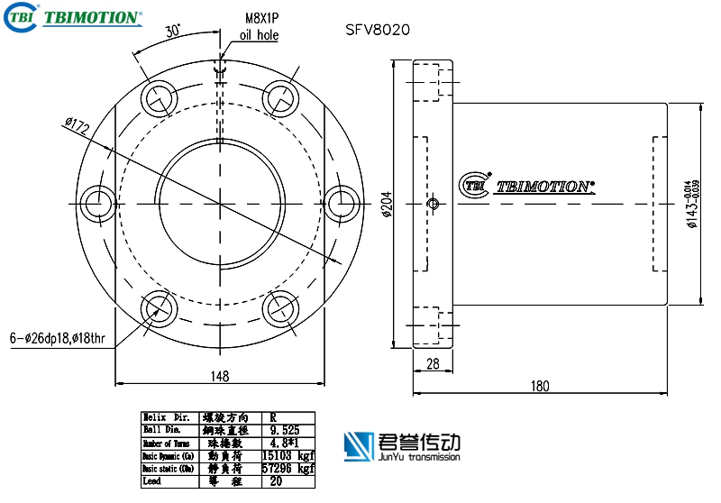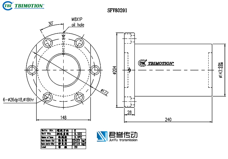 tbi滾珠絲桿螺母SFVR08020D1D,SFNIR08020D1N,法蘭雙切邊或者全圓,絲桿直徑80,導程20,珠圈數(shù)4.8*1,珠直徑9.525,動額定負荷15103,靜額定負荷57296,剛性168。