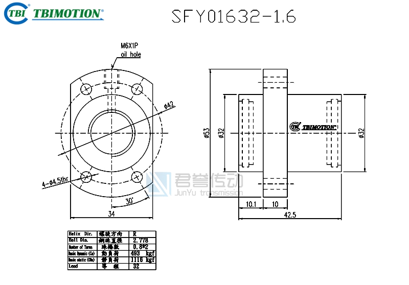 tbi滾珠絲桿螺母SFYR01632T2D,絲桿直徑16,導程32,螺母總長42.5,珠直徑2.778,珠圈數0.8*2,動額定負荷493,靜額定負荷1116,剛性11.