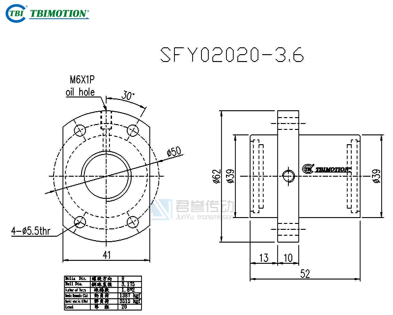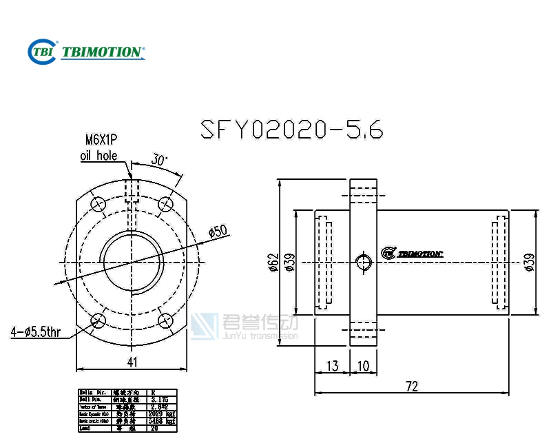 tbi滾珠絲桿SFY2020螺母尺寸圖示: