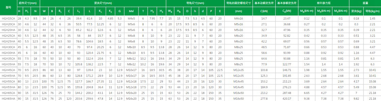 臺(tái)灣上銀直線導(dǎo)軌HG系列型號(hào)及參數(shù):