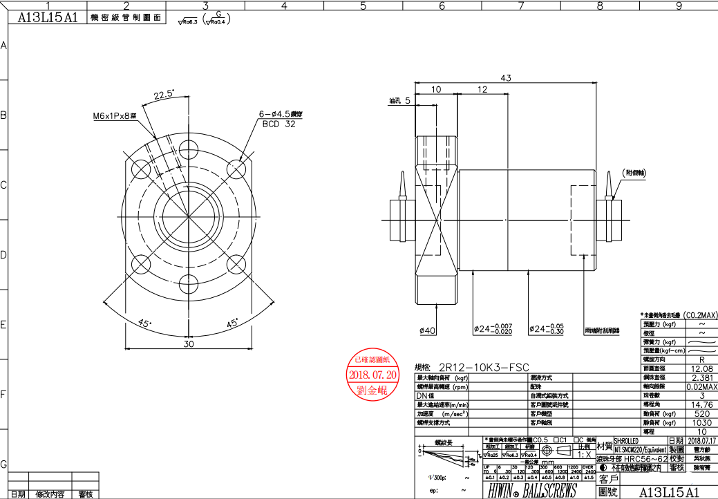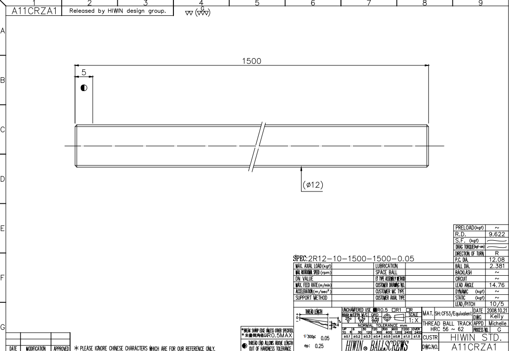 臺灣上銀滾珠絲桿,絲桿直徑12,導(dǎo)程10,F(xiàn)SC系列高速靜音型,螺母總長43MM,BCD32MM,珠徑2.381MM,絲桿總長1500MM.