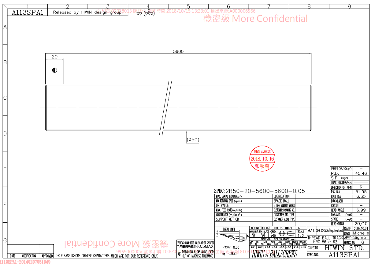 臺灣上銀滾珠絲桿2R50-20K4-FSC-0.05,上銀FSC系列靜音型滾珠絲桿,絲桿直徑50,導(dǎo)程20,珠徑6.35,絲桿最長總長5600MM,螺母安裝尺寸BCD93,螺母總長108,C7級精度,重復(fù)定位精度0.05,絲桿動負(fù)荷5810KGF,靜負(fù)荷18670KGF.