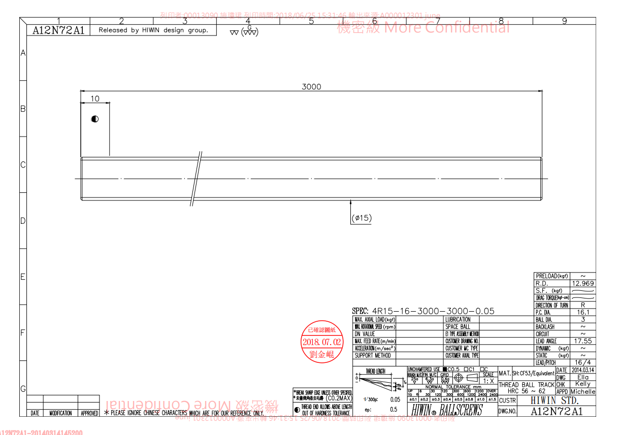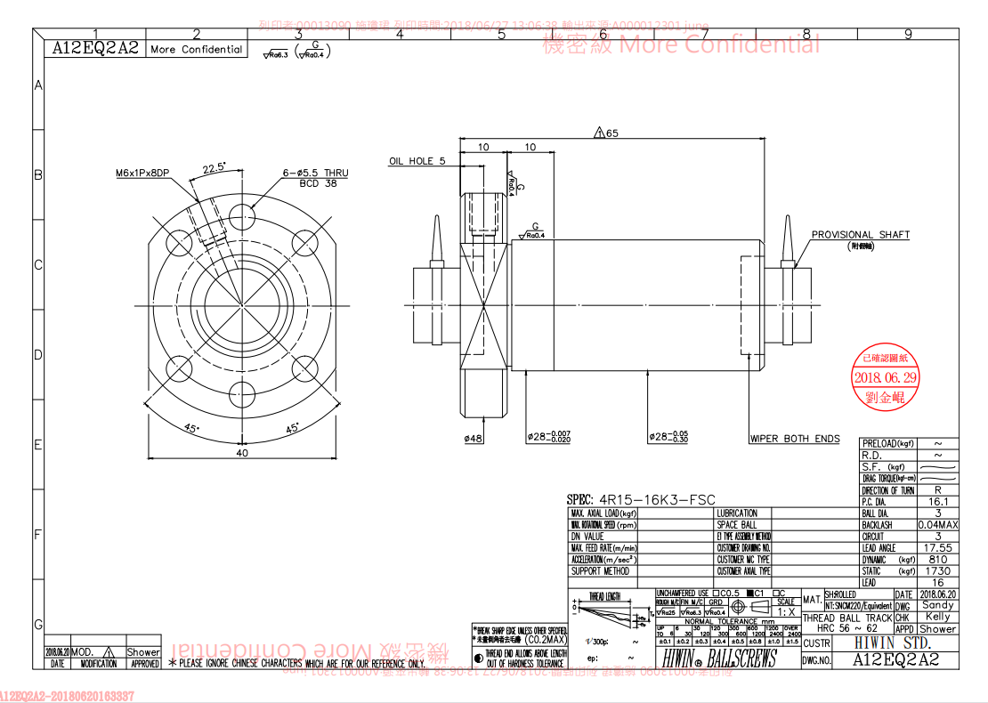 臺灣上銀滾珠絲桿2R15-16K3-FSC-0.05,上銀FSC系列靜音型滾珠絲桿,絲桿直徑15,導程16,絲桿總長3000MM,螺母總長65,BCD38,珠徑3.0,C7級精度,重復定位精度0.05,絲桿動負荷810KGF,靜負荷1730KGF.