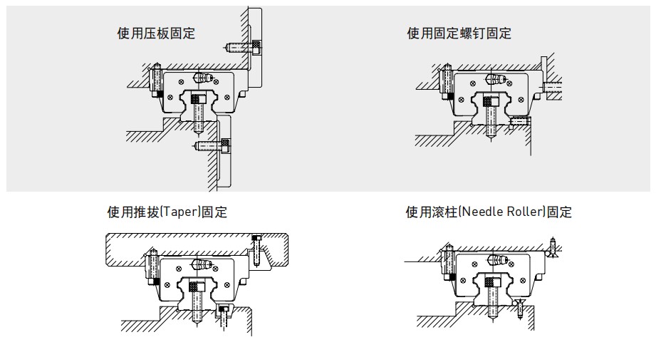 床臺(tái)受到震動(dòng)、沖擊力的作用下、滑軌跟滑塊可能偏離原來(lái)的固定位置、從而影響精度。為了避免發(fā)生以上類似的情況、建議使用下圖四種固定滑塊滑軌、以確保機(jī)臺(tái)的運(yùn)行精度。