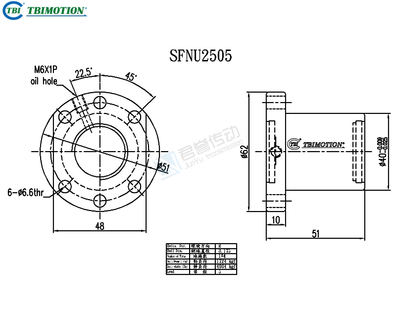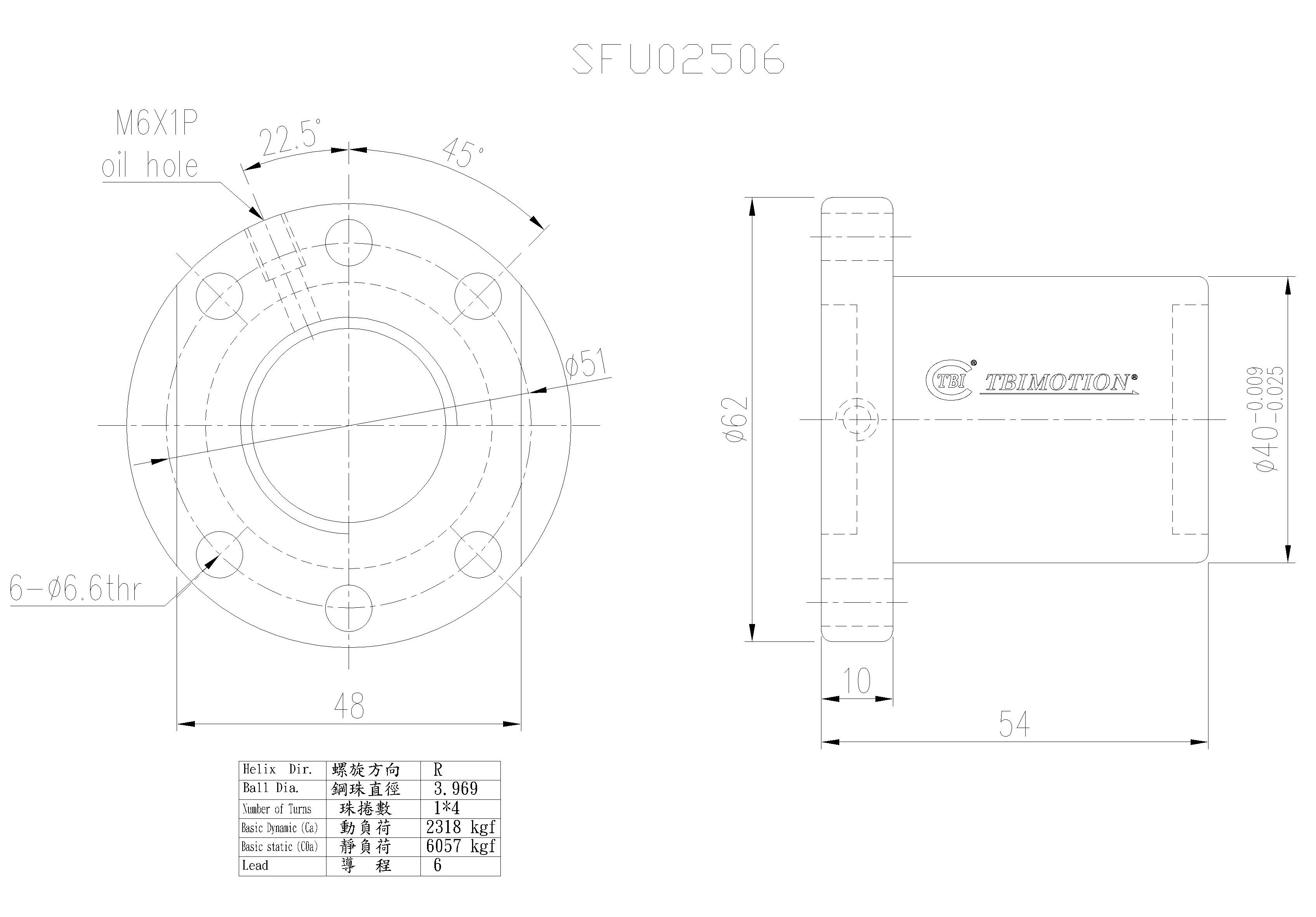 TBI滾珠絲桿SFUR02506T4D,絲桿直徑25,導程06,鋼珠圈數(shù)4,鋼珠直徑3.969,雙切邊法蘭,安裝孔6孔,動額定負荷2318,靜額定負荷6057,剛性47