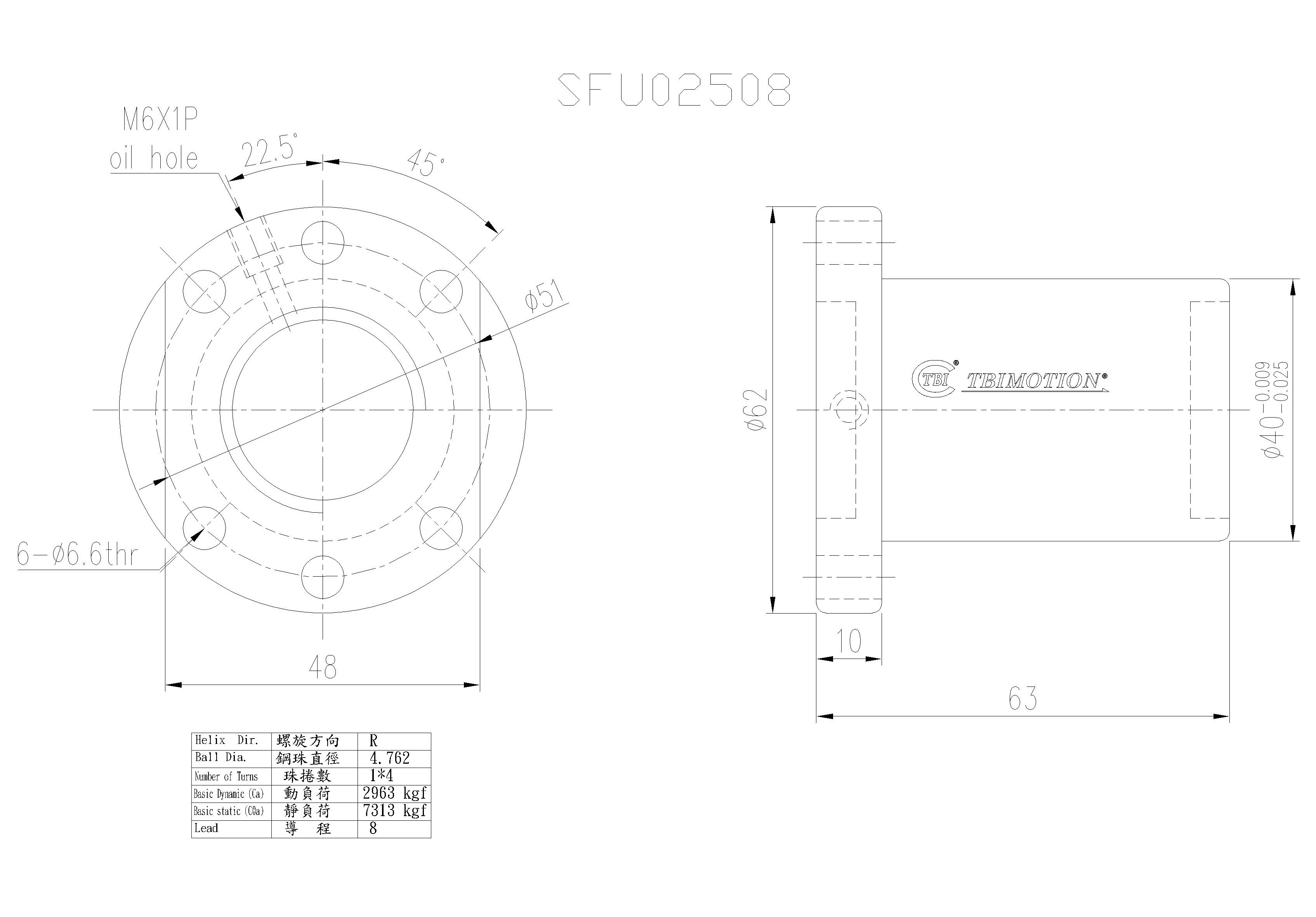TBI滾珠絲桿SFUR02508T4D,絲桿直徑25,導程08,鋼珠圈數(shù)4,鋼珠直徑4.762,雙切邊法蘭,安裝孔6孔,動額定負荷2963,靜額定負荷7313,剛性49