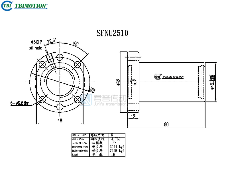 TBI滾珠絲桿SFNUR02510T4D,絲桿直徑25,導程10,鋼珠圈數(shù)4,鋼珠直徑4.762,雙切邊法蘭,安裝孔6孔,動額定負2954,靜額定負荷7295,剛性50