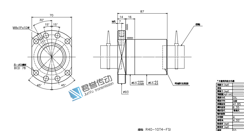 示例型號:R40-10T3-FSI-4500-0.05 絲桿可按圖紙定制軸承位、加工精度保證