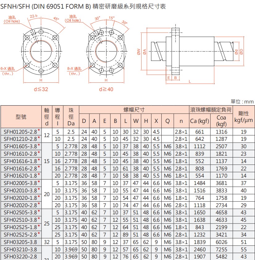 SFH系列為高速強化防塵型滾珠螺桿,具有高速性、高負載及高剛性等特性,具有高順暢度,且SFH的特殊設計使其防塵效果大幅的提升,循環(huán)結構的強化使其更適合在高速的環(huán)境下運作。