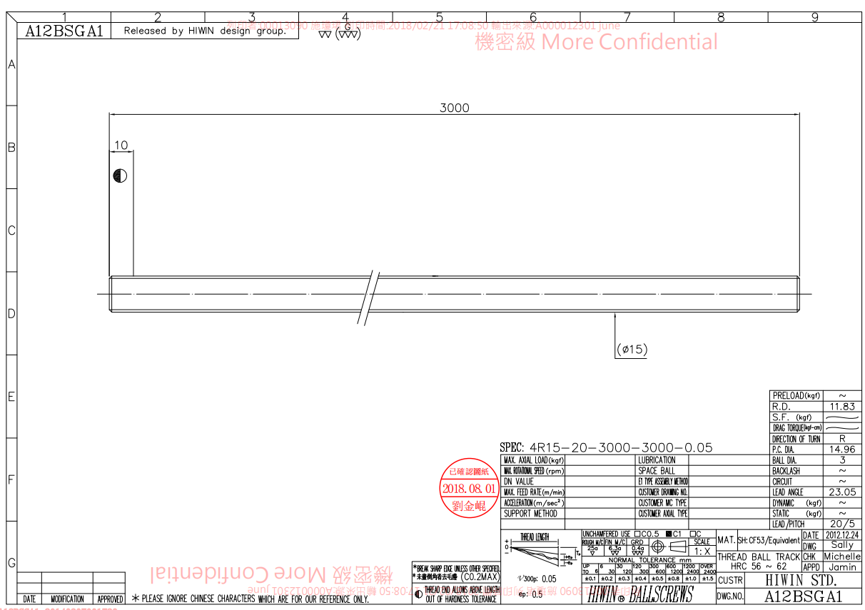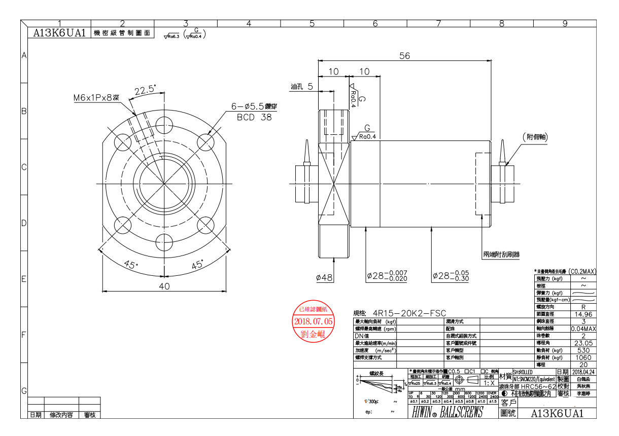 臺灣上銀滾珠絲桿4R15-20K2-FSC-0.05,上銀FSC系列靜音型滾珠絲桿,絲桿直徑15,導程20,絲桿總長3000MM,軋制絲桿C7級精度,重復定位精度0.05,螺母總長56,BCD38,珠徑3.0,絲桿動負荷530KGF,靜負荷1060KGF.