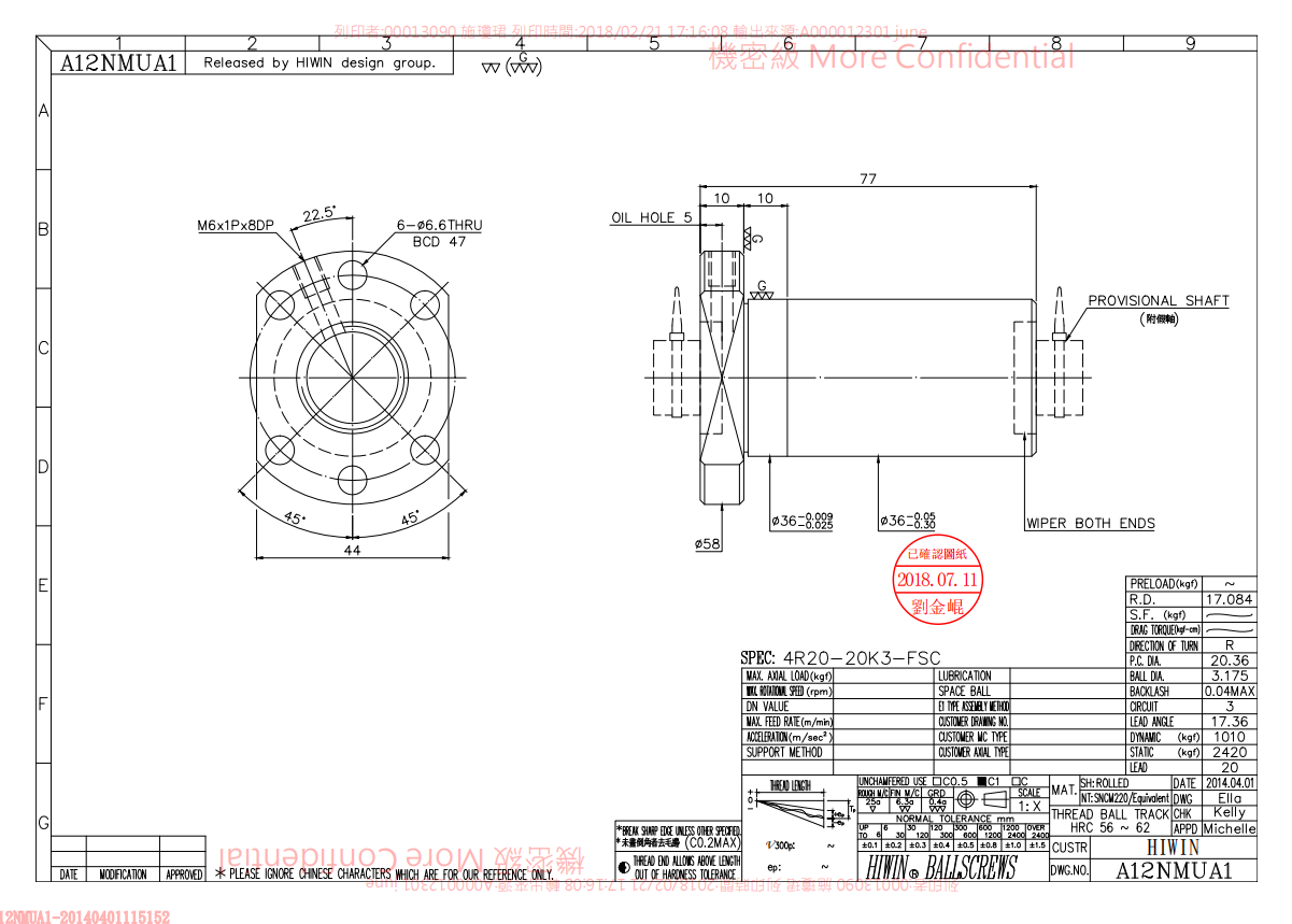 臺(tái)灣上銀滾珠絲桿4R20-20K3-FSC-0.05,上銀FSC系列靜音型滾珠絲桿,絲桿直徑20,導(dǎo)程20,絲桿總長(zhǎng)3000MM,C7級(jí)精度冷軋絲桿,重復(fù)定位精度0.05,螺母總長(zhǎng)77,BCD47,珠徑3.175,動(dòng)負(fù)荷1010KGF,靜負(fù)荷2420KGF.
