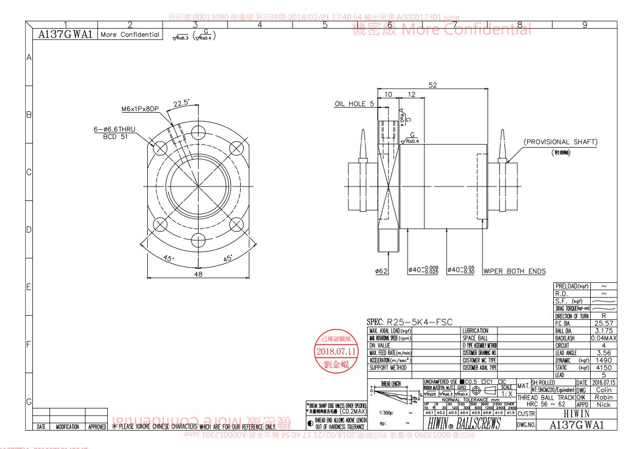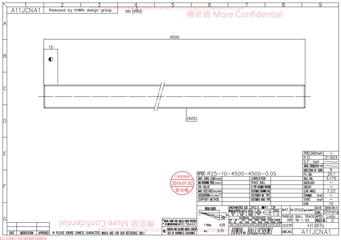 臺灣上銀滾珠絲桿R25-10K4-FSC-0.05,絲桿直徑25,導程10,螺母總長52,BCD51,珠徑3.175,絲桿重復定位精度0.05.絲桿動負荷1490KGF,靜負荷4150KGF.